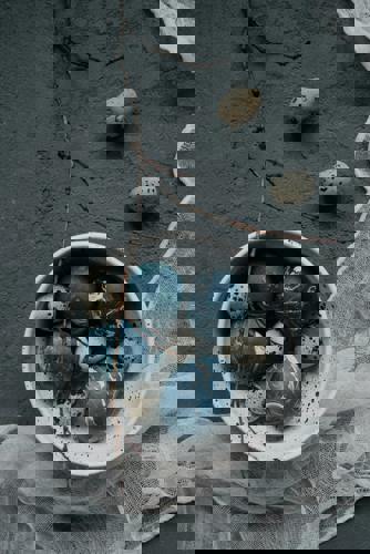 This exciting design is easy to accomplish and creates a stunning effect. Paint or dye your egg the colour of your choice. Once dry, fill a container with room-temperature water and add drops of 2-3 colours of nail varnish or acrylic paint to the surface of the water. Use a toothpick to swirl the colours together. Quickly dip your egg into the swirls to coat the shell. Repeat until you have the desired effect.