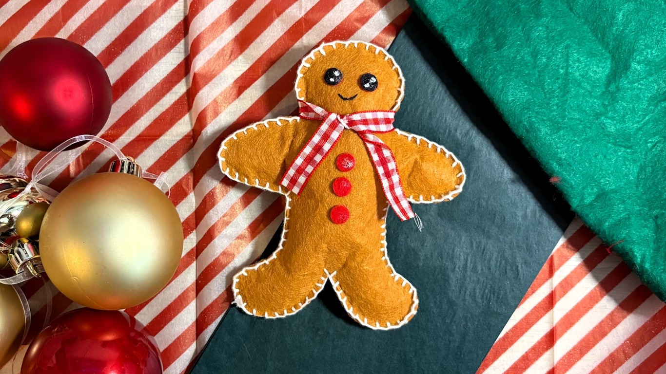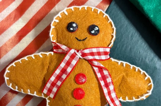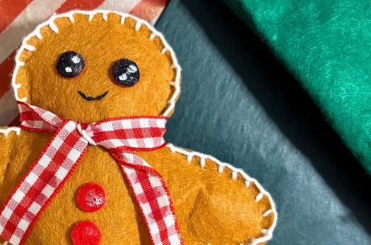 To customise your gingerbread man, you could add a scarf or bowtie, add thread to his cheeks for blush or even a Santa hat.