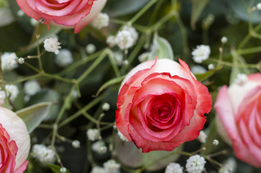 Prioritise soft romantic colours and avoid rigid formal structures. Look for flowers such as Roses, Delphiniums and Peonies.
