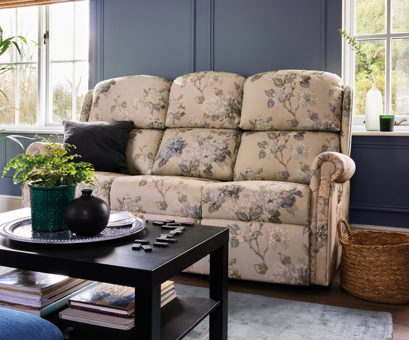 A beautifully proportioned reclining sofa with elegantly shaped arms and soft, supportive cushioning.